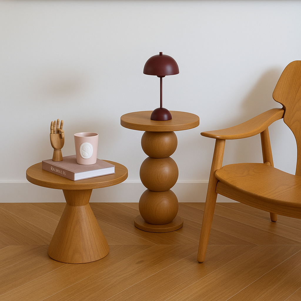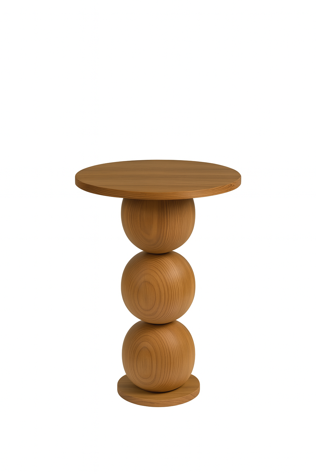 A escolha do freijó traduz a delicadeza de deixar a madeira em segundo plano, para que a forma emerja em toda sua intensidade. É uma dança silenciosa, congelada no tempo, mas que transmite leveza, equilíbrio e fluidez. O empilhamento das três esferas cria uma verticalidade ritmada, como se cada módulo fosse um “passo” ou “batida” dentro de uma coreografia silenciosa, conferindo movimento à peça.