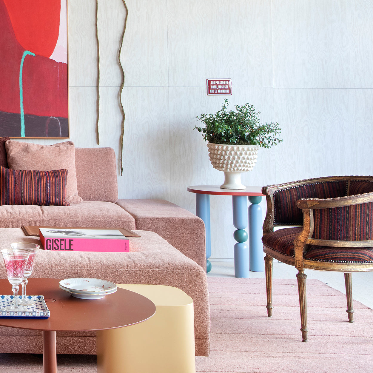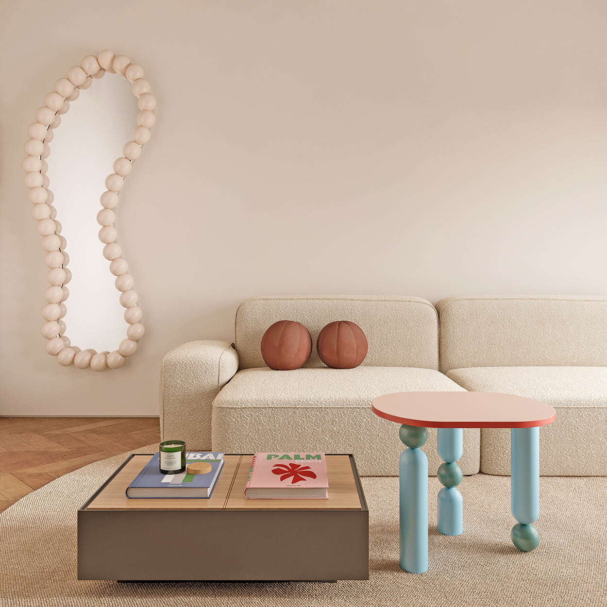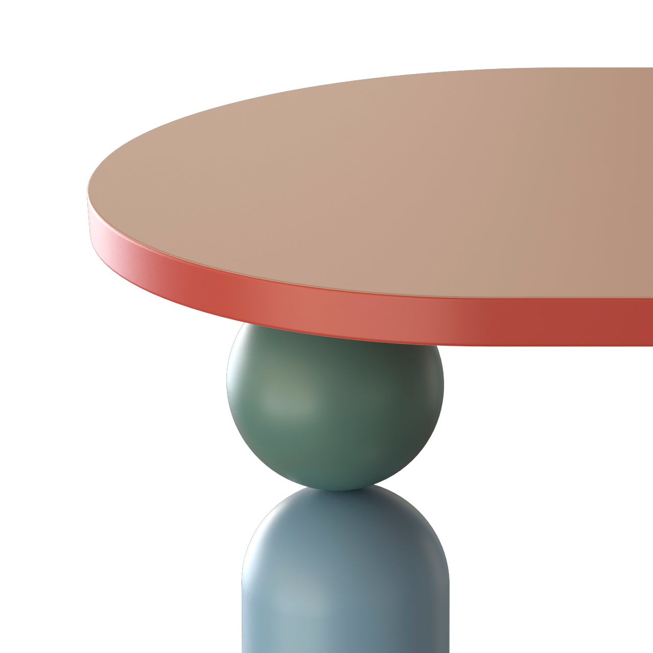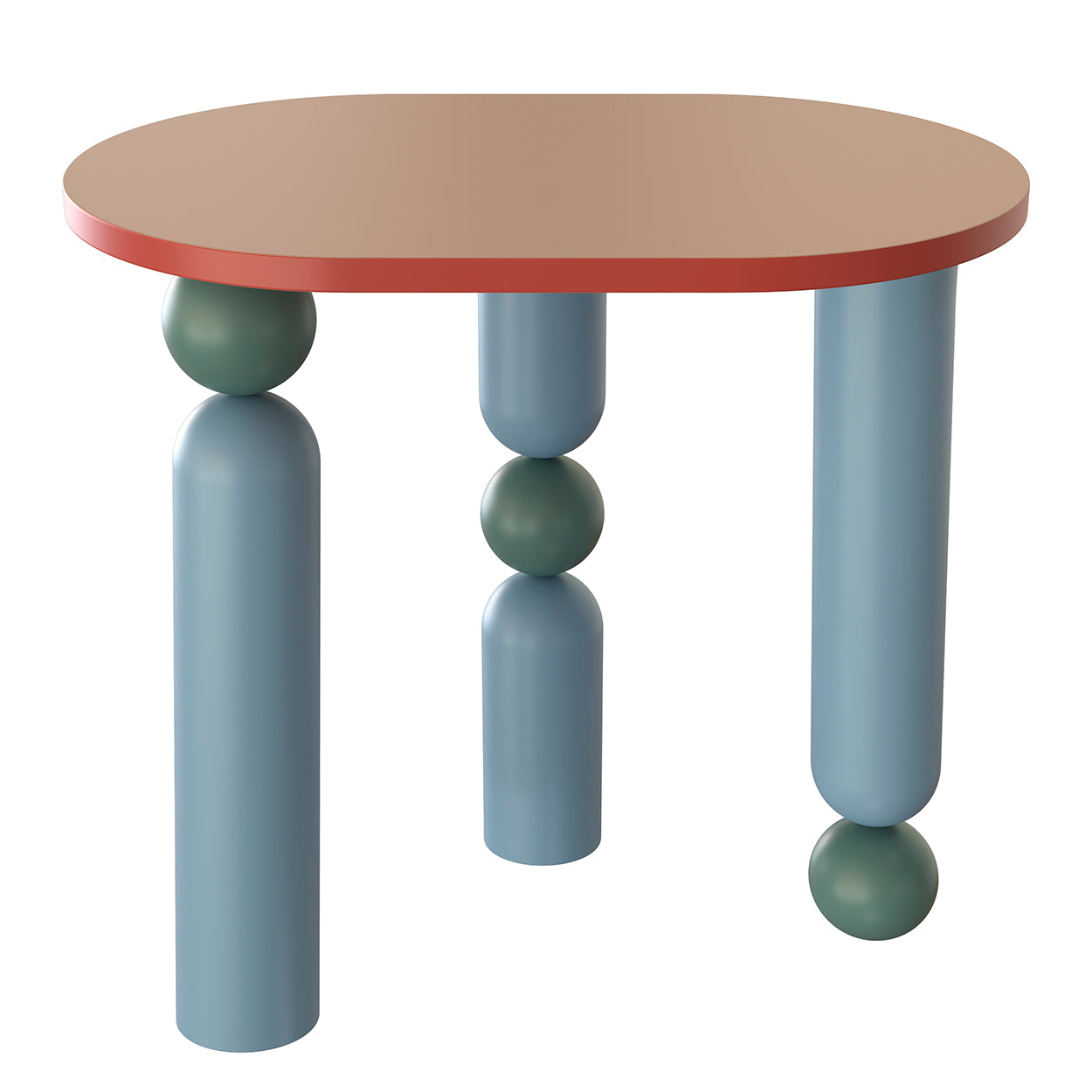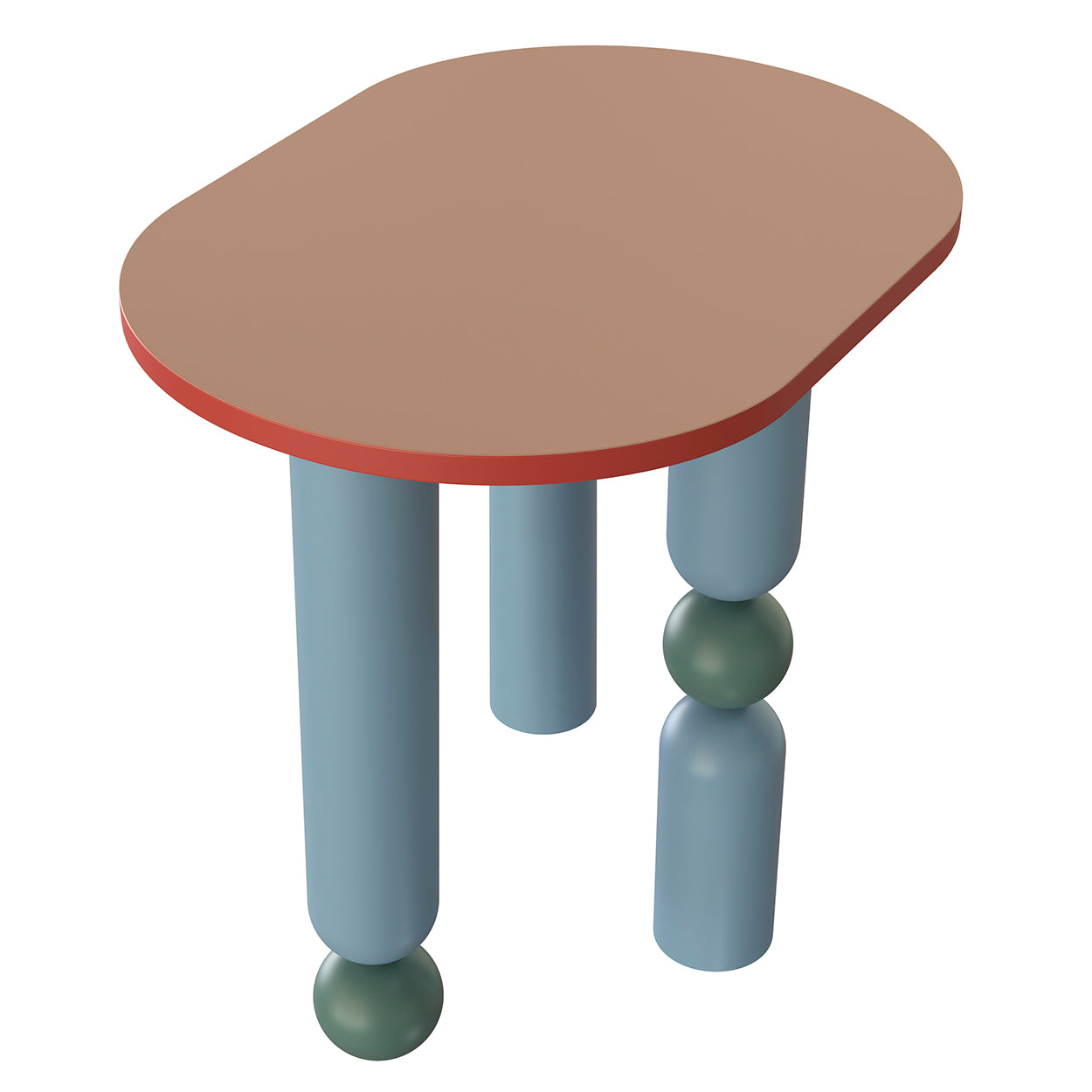 Sua estrutura evoca os arranjos geométricos e quase arquitetônicos presentes na pintura — como os edifícios industriais, chaminés, silos e elementos urbanos que Tarsila sintetiza com uma linguagem lírica e vibrante. A paleta da peça dialoga diretamente com as cores características da artista, como o “azul Tarsila” e os tons terrosos, traduzindo em matéria tridimensional a atmosfera cromática da obra. O tampo com cantos suavemente arredondados reforça a leveza e a fluidez do conjunto, contrapondo-se à rigidez da estrutura urbana.
