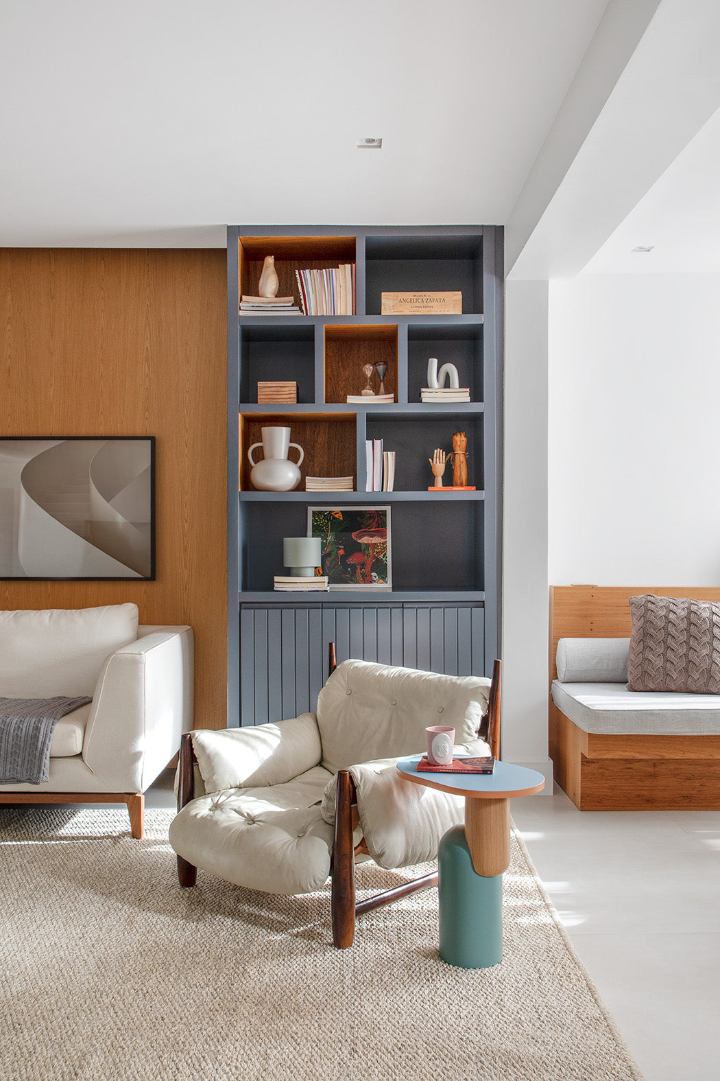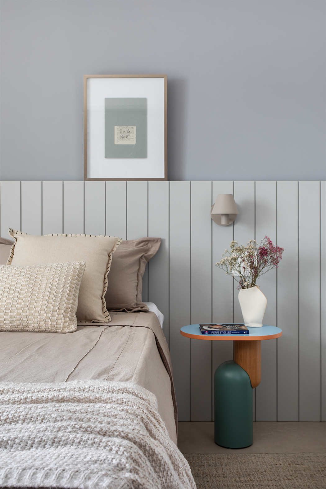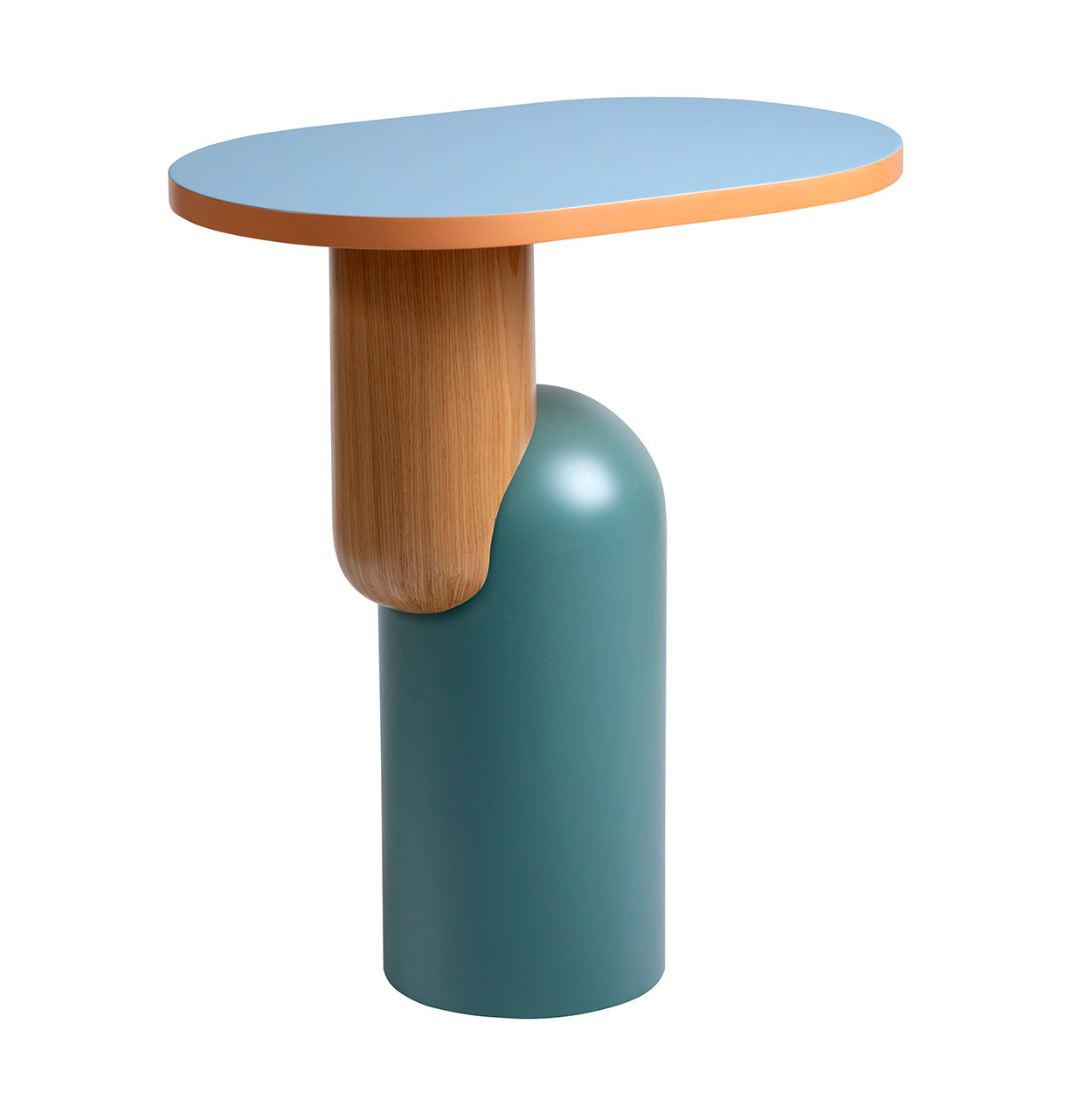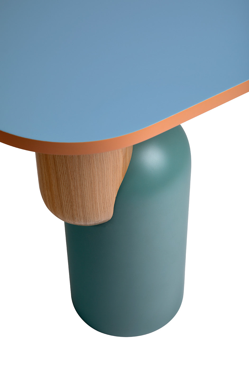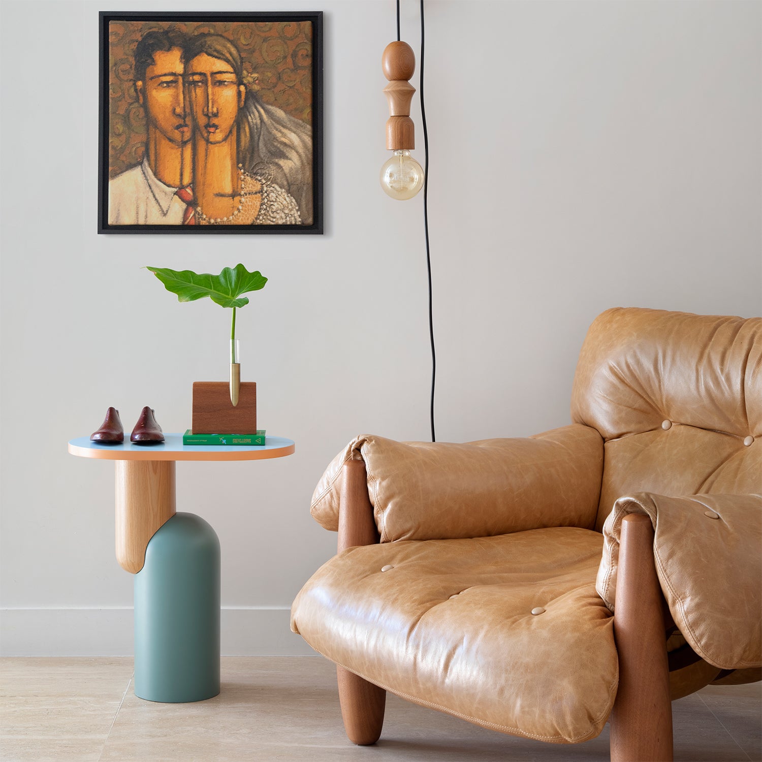 Assim como na pintura, onde a figura monumental contrasta com o cacto esguio sob um céu intenso, a Mesa Sertão constrói seu próprio jogo de escala: um tampo horizontal de cantos suaves repousa sobre uma base alta e vertical, alcançando equilíbrio e presença escultórica. A paleta reinterpreta os tons da obra — azul do céu, verde profundo, laranja solar e o calor orgânico da madeira — em uma harmonia cromática sofisticada e atemporal.