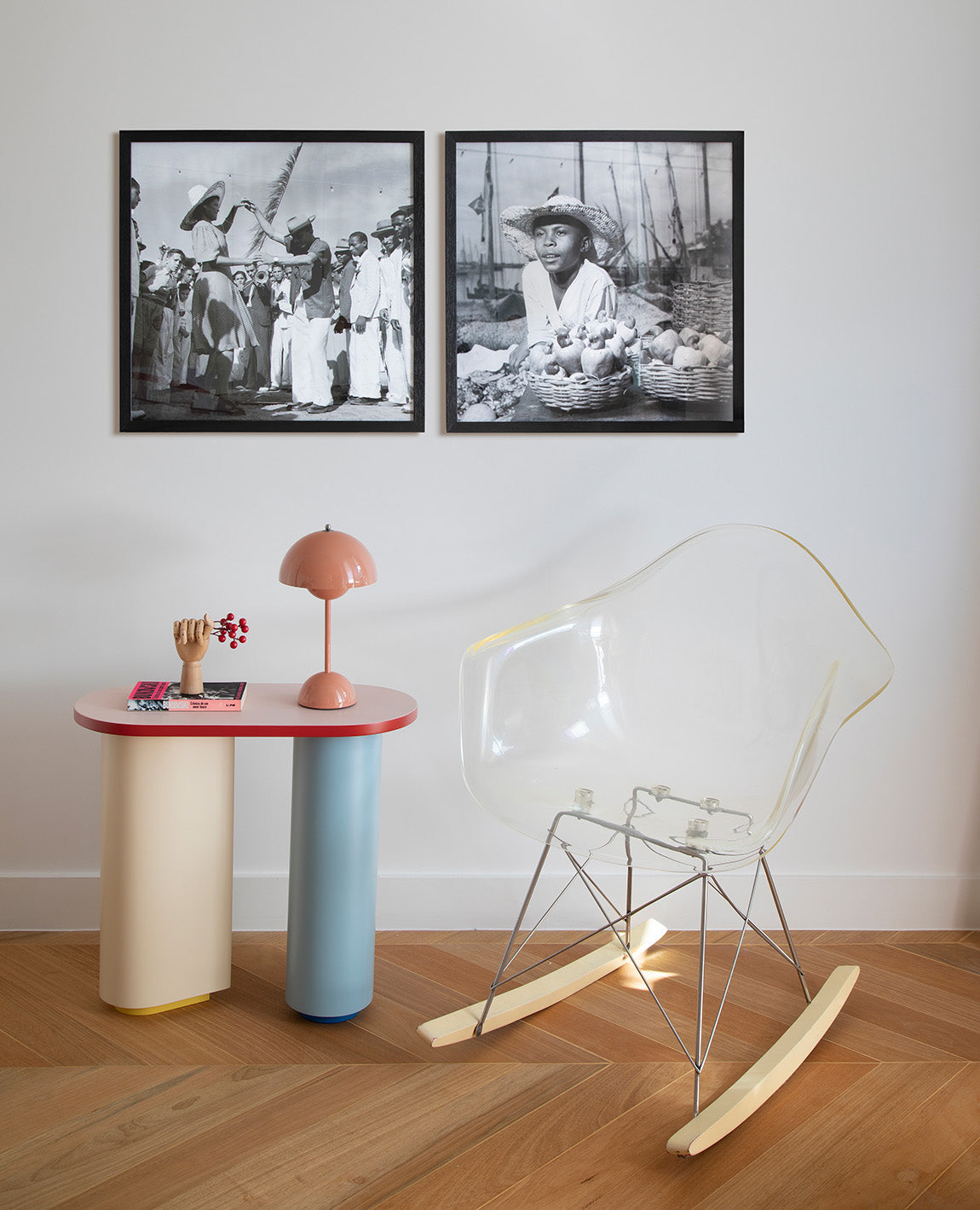 A paleta retoma a essência cromática do movimento — vermelho, azul e amarelo — aplicados com rigor construtivo, em contraste com o neutro suave que equilibra a composição. O contorno vermelho do tampo, o pé prismático azul e a base amarela do pé cilíndrico criam um diálogo direto com as experiências cromáticas de Johannes Itten e Wassily Kandinsky, mestres da Bauhaus.