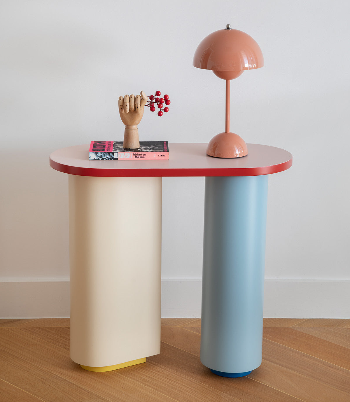 Inspirada nos princípios da escola Bauhaus (1919–1933), esta peça traduz para o design colecionável contemporâneo a união entre função, forma e cor que marcou a história do modernismo. Assim como os mestres da Bauhaus, a peça parte de formas geométricas puras para criar equilíbrio e harmonia: um pé prismático e outro cilíndrico sustentam o tampo elíptico, compondo uma estrutura assimétrica de perfeita estabilidade.