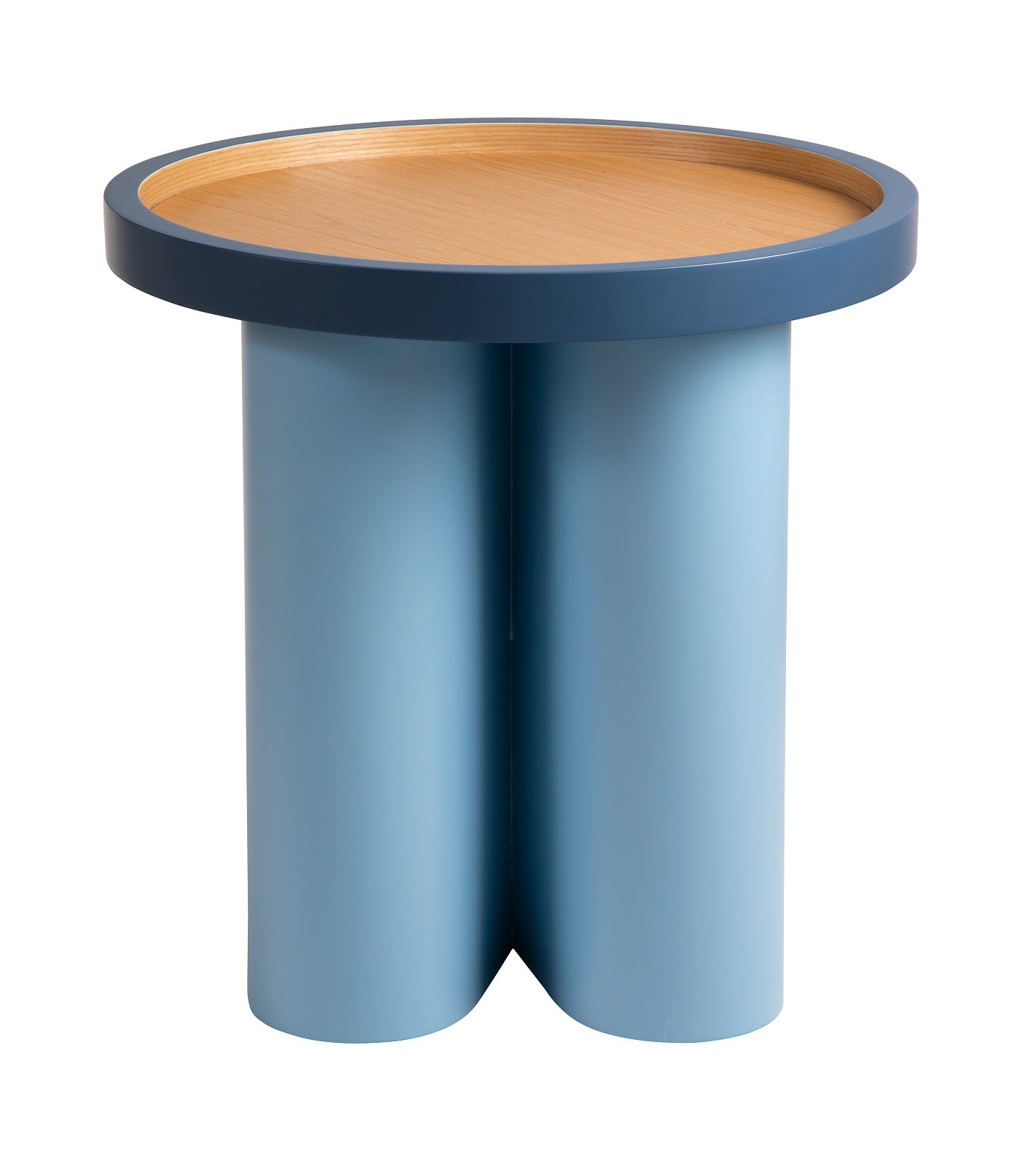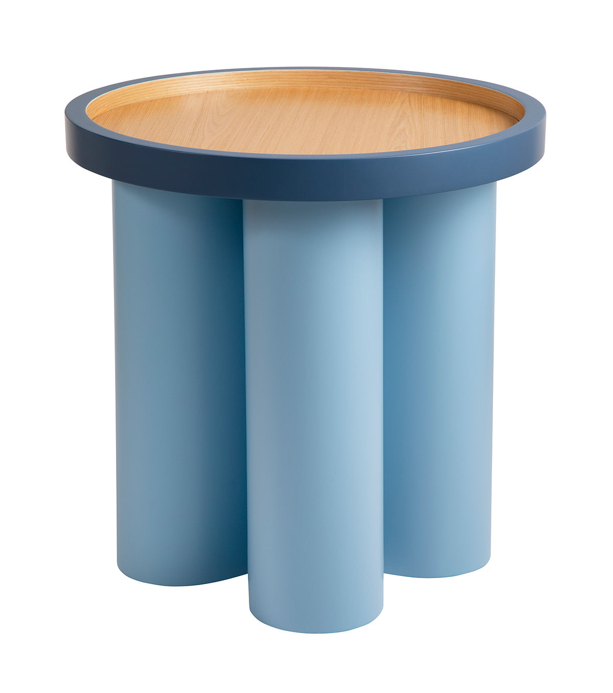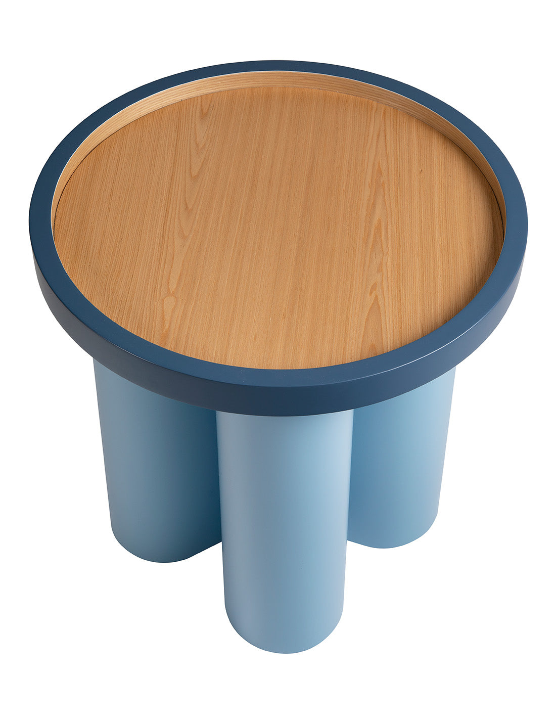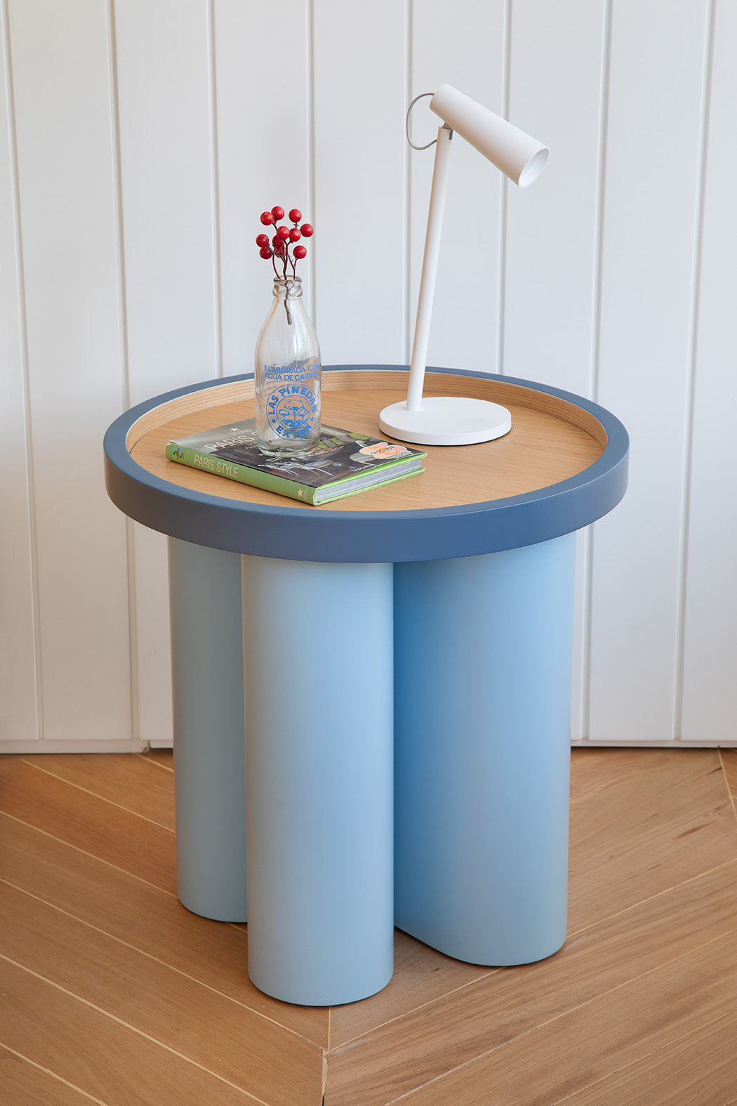 Na Mesa de Apoio Vicente, essa cadência se revela na repetição rítmica das colunas cilíndricas que sustentam o tampo, criando uma sensação de fluxo e continuidade. A paleta ecoa a pintura: o azul suave das colunas, o azul intenso da borda e o calor amadeirado do tampo remetem ao diálogo entre céu e terra presente no quadro, onde o brilho dourado contrasta com a vastidão azulada.