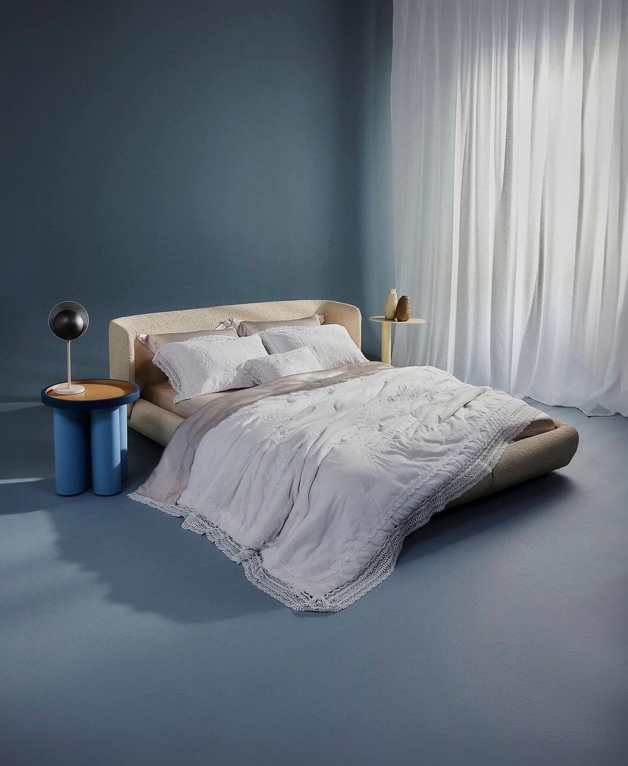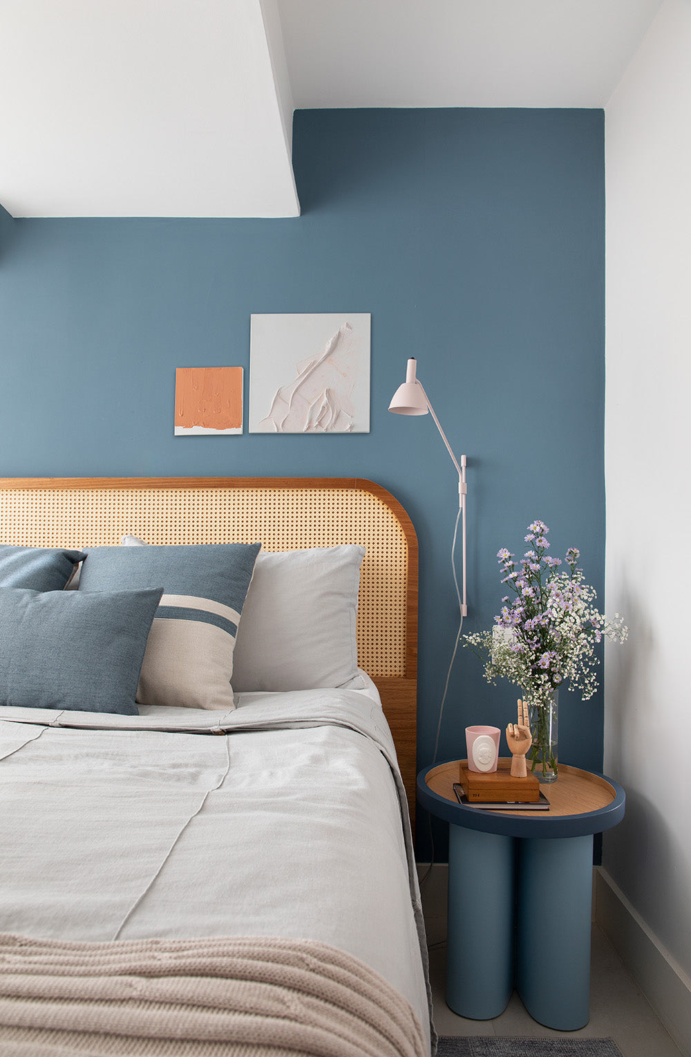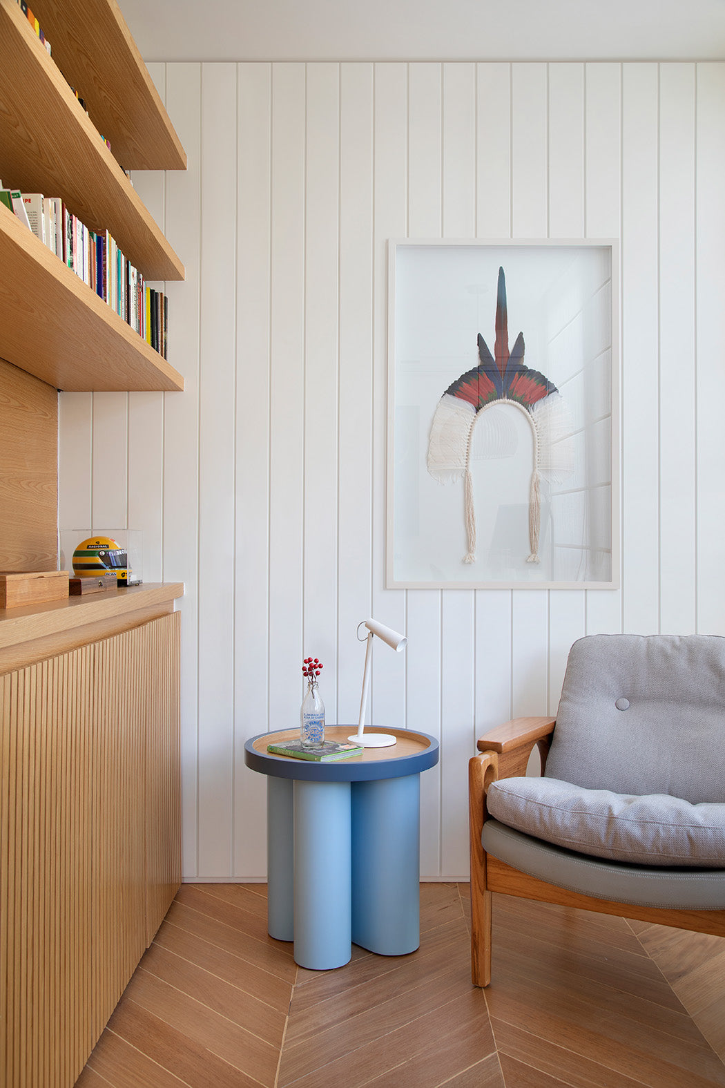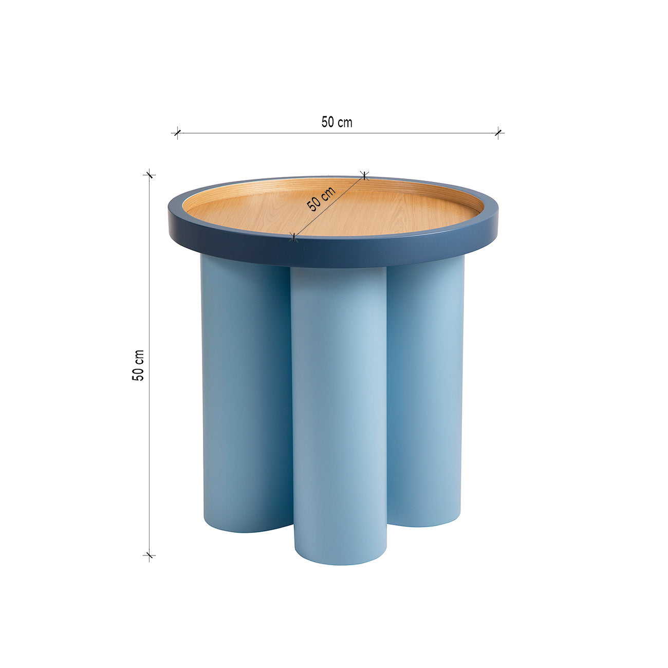 Na Mesa de Apoio Vicente, essa cadência se revela na repetição rítmica das colunas cilíndricas que sustentam o tampo, criando uma sensação de fluxo e continuidade. A paleta ecoa a pintura: o azul suave das colunas, o azul intenso da borda e o calor amadeirado do tampo remetem ao diálogo entre céu e terra presente no quadro, onde o brilho dourado contrasta com a vastidão azulada.