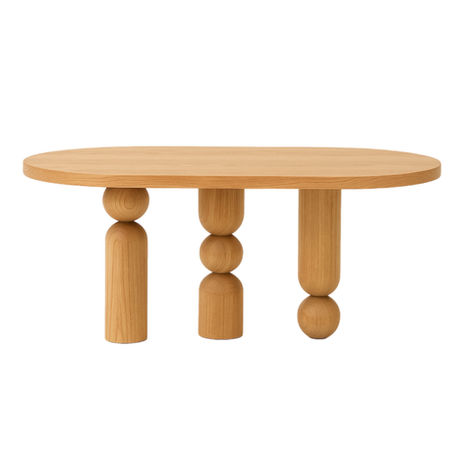 Sua estrutura evoca os arranjos geométricos e quase arquitetônicos presentes na pintura — como os edifícios industriais, chaminés, silos e elementos urbanos que Tarsila sintetiza com uma linguagem lírica e vibrante. A paleta da peça dialoga diretamente com as cores características da artista, como o “azul Tarsila” e os tons terrosos, traduzindo em matéria tridimensional a atmosfera cromática da obra. O tampo com cantos suavemente arredondados reforça a leveza e a fluidez do conjunto, contrapondo-se à rigidez da estrutura urbana.